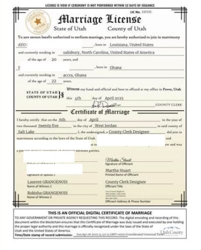 Since Ayo’s true residence is not in the United States, the fact that the certificate lists North Carolina as her home state suggests potential legal complications and possibly intentional misrepresentation. If genuine, this certificate should be reported to the relevant authorities in Utah due to these inconsistencies.